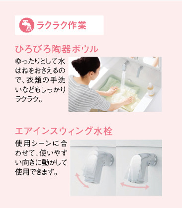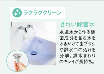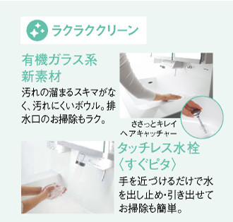 アカをはじく新素材を使うことで、汚れにくく、タッチレス水栓でムダなく省エネ。