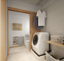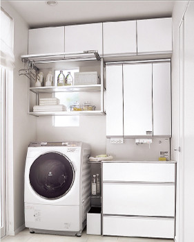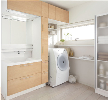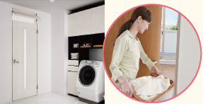 洗濯室も兼ねる洗面室は、洗面化粧台の使いやすさと収納力をチェック。