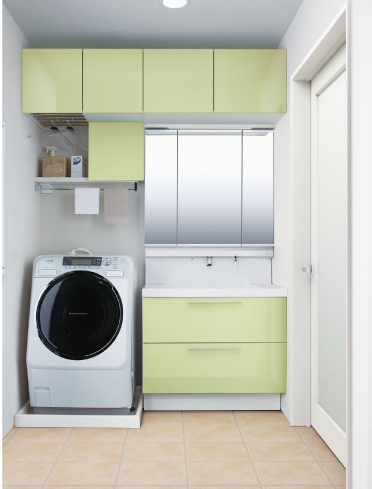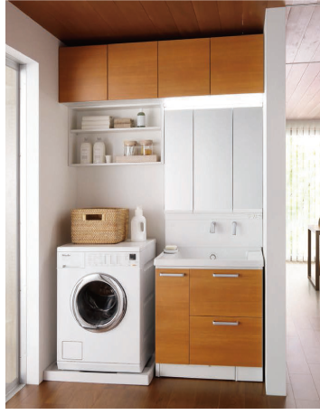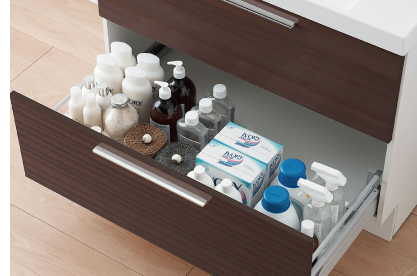 家族みんなの使いやすさを考え、大きくて使いやすい洗面器を備えたスタンダード洗面台。ムダを作らない収納アイテムをプラス。