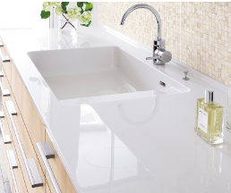 一体形カウンターでお手入れが簡単なボウルと汚れにくい水栓。