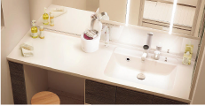 カウンター、水栓、ミラー、収納キャビネットを選んで組み合わせるタイプ。広い間口にも対応でき、多彩なプランニングが可能。