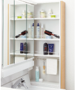 木目の収納棚にスライド可能なミラーを付けたおしゃれなキャビネット。