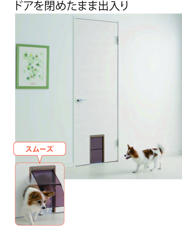 ペット用のくぐり戸を備えたドア。下枠のない三方枠なのでペットの出入りがラクラク。