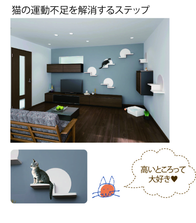後付けが簡単にできる壁面造作部材。滑りにくくて、掃除もラクラク、猫が安心して遊べるステップです。汚れが付かない背面パネルも用意。