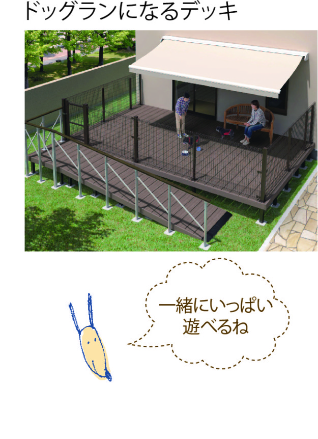 リビングとつながるウッドデッキは、家族と愛犬が一緒に遊ぶスペースに最適。テラスやオーニングをプラスすれば天気を気にせず使えます。