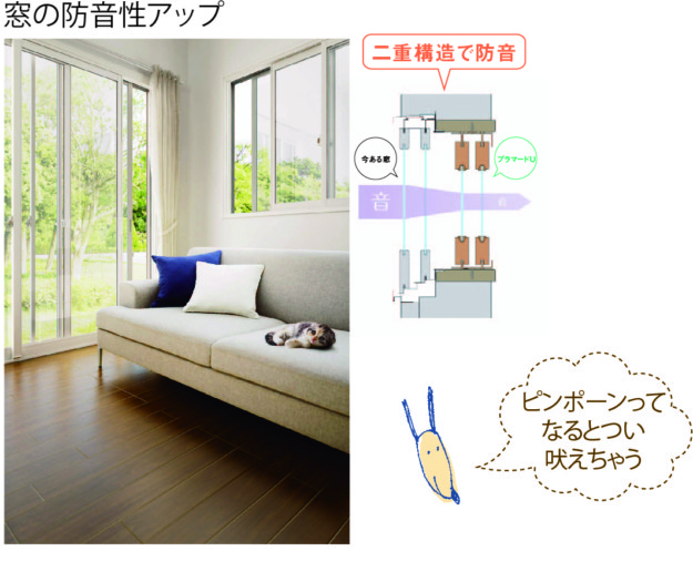 気密性の高い樹脂窓を今の窓の上から取付けて二重窓にすることで音が伝わりにくくなります。断熱性もアップして快適。