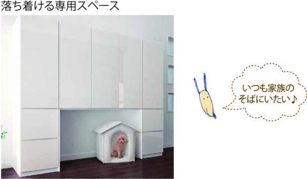ユニット収納の一部をペット専用スペースに。傷や汚れに強いペットパネルを取付。ペットのケージやトイレが置けて、インテリアにもマッチ。