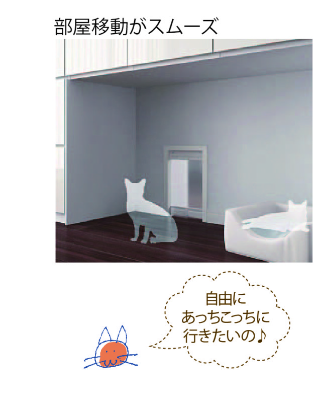 壁で仕切られた空間も自由に出入りできるキュートな壁内くぐり戸。ペットが自由に遊び回れます。