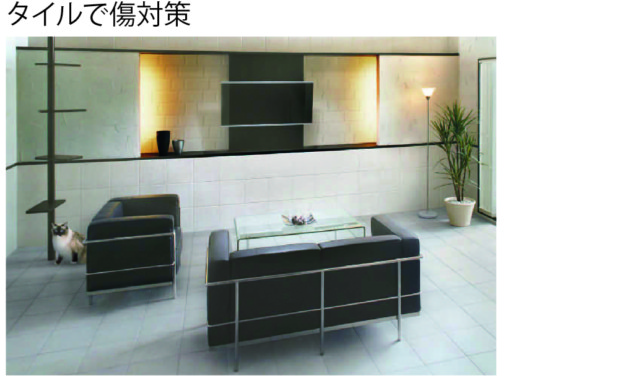 床と腰壁までは硬いタイルを張ることで、汚れや傷に対処。壁のタイルは調湿・消臭効果のあるインテリアタイルがおすすめです。