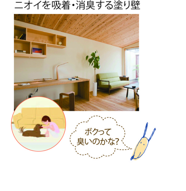 気になるペットのニオイ。ニオイ対策には通風や換気が一番のポイントですが、消臭・調湿性の高い内装材を使うのも有効です。