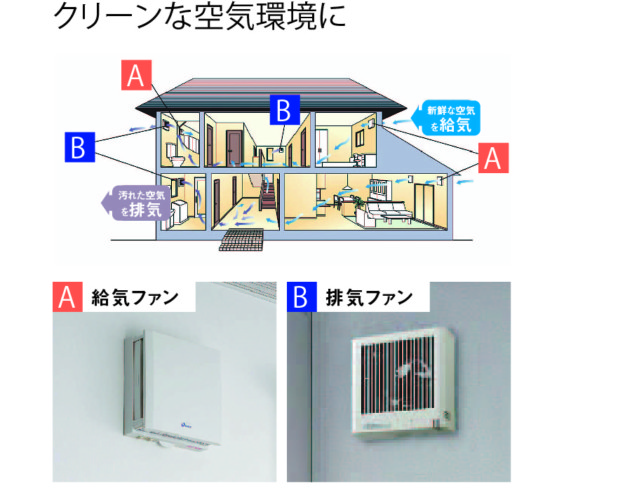 ニオイ・湿気・汚れた空気を排出し、新鮮な空気を取り込む24時間換気システム。人やペットの健康を守る、クリーンな空気環境をつくります。