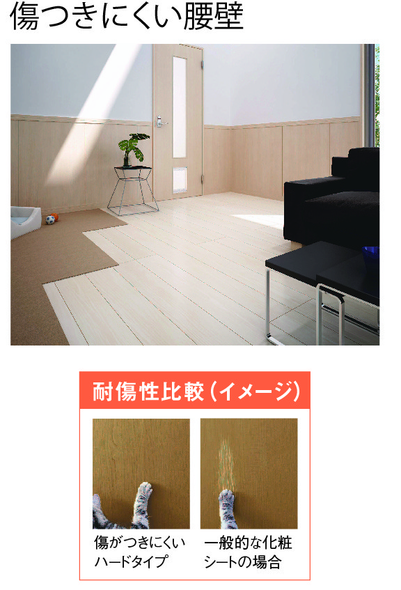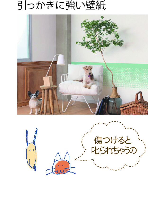 爪の引っかきに強い表面強化壁紙。デザイン性と汚れ防止、抗菌などの機能性を両立。
