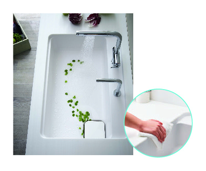 排水口に向かって水がゴミと一緒に流れるからシンクはいつもキレイ。カウンターとシンクの段差もなくお手入れラクラク。