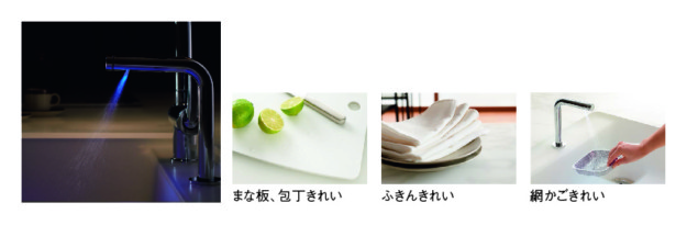 水道水に含まれる塩化物イオンを電気分解して作られる除菌成分を含む水(きれい除菌水)をキッチンワークの仕上げにふきかけることで3つのきれいを実現。