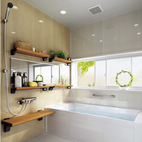 入浴をもっと楽しむために思いやりと遊び心をプラス。断熱性や安全性に加え、お気に入りのアイテムを飾って収納できるシェルフで入浴タイムがさらに充実。