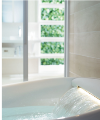 基本性能の充実はもちろん、ゆったりとくつろげる浴室のために、肩湯、シャワーなどさまざまな形のお湯、さらにデザインや照明、マテリアルにまでこだわったバスルーム。